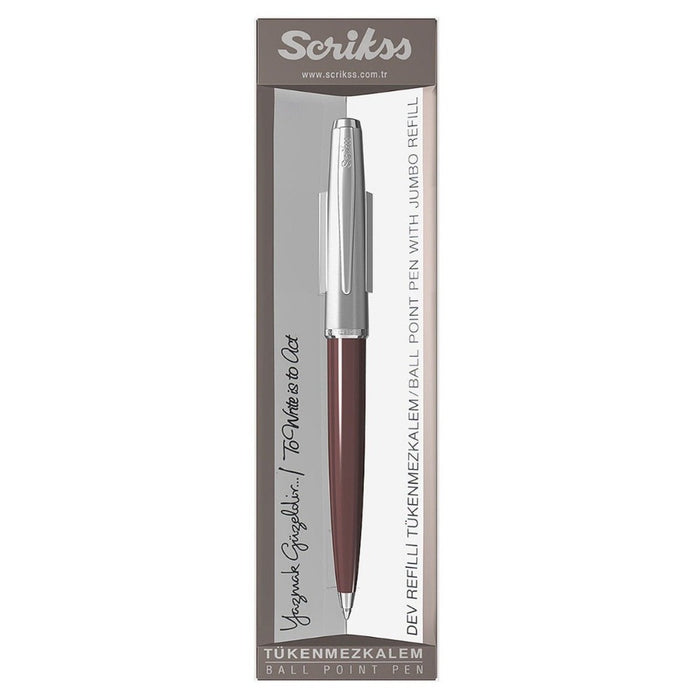 Stainless brushed steel upper body. Brass accessories plated with chromium. Stainless steel clip plated with chromium - arc type. Click Mechanism. Burgundy acrylic carbon fiber lower body. Scrikss Roller refill (see consumables).