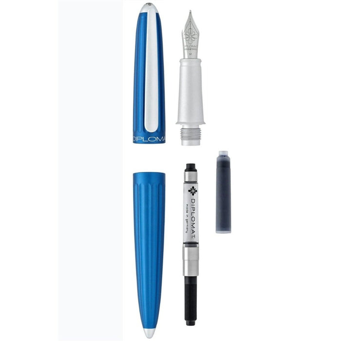This Diplomat Aero fountain pen features a Zeppelin-inspired anodized aluminum body with groove-like depressions on the blue barrel and blue cap. It has a satisfying soft sliding click cap that posts securely onto the barrel when writing. It features a smooth writing #6 JoWo stainless steel nib, a dark grey grip and trim, and fills via standard international cartridge/converter (both are included).