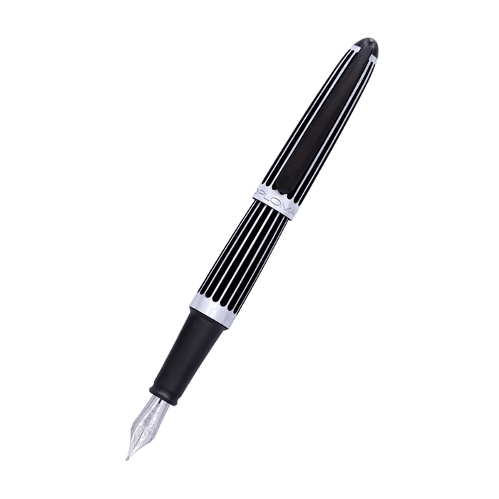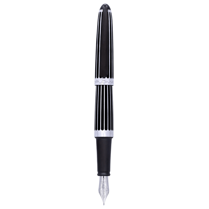Diplomat Aero Writing Stripes Black comes with Matt Black trims and is Cartridge, Converter (Included) filling mechanism. It is enhanced with a precision Stainless Steel #6 nib made JoWo. It comes packaged in a nice and elegant gift box."