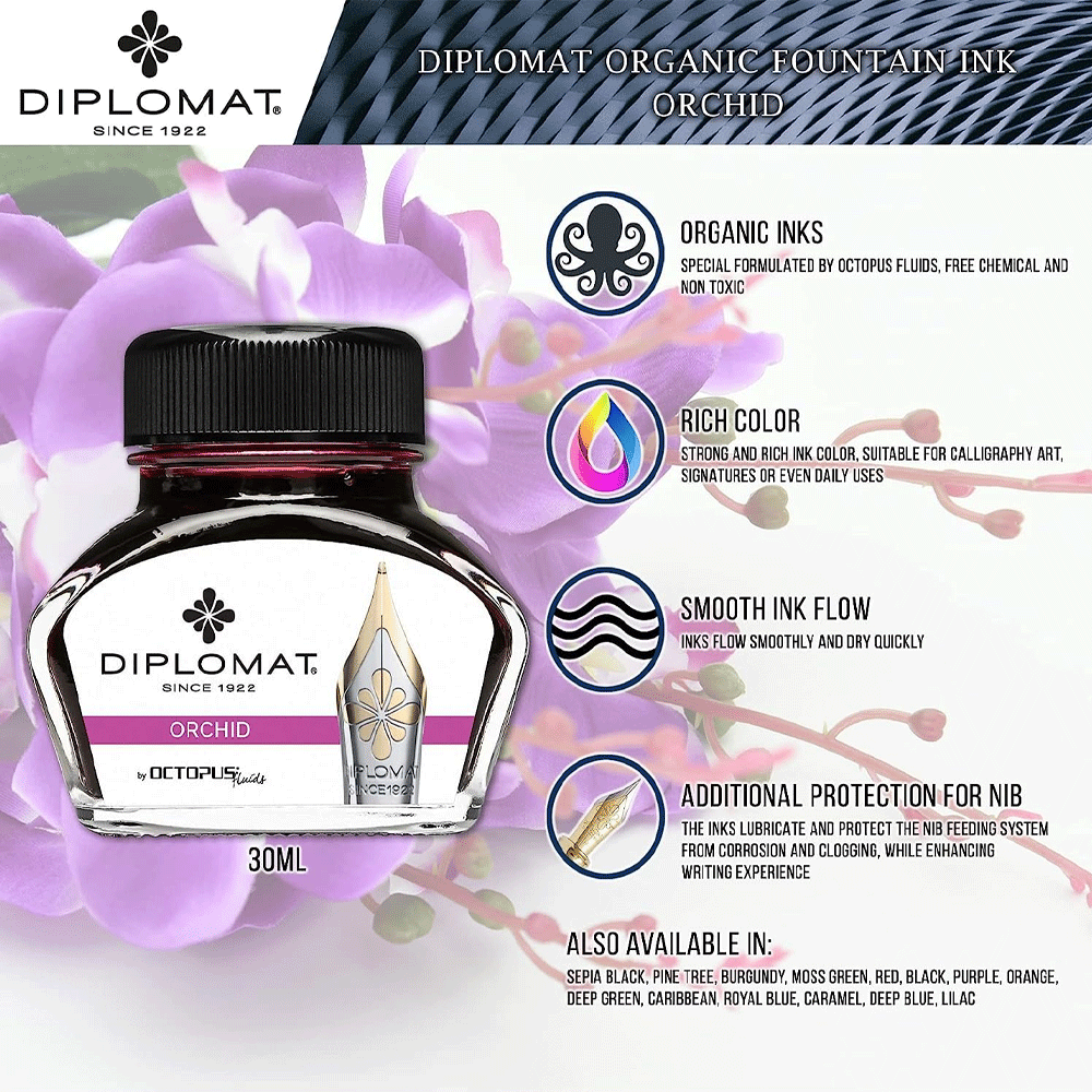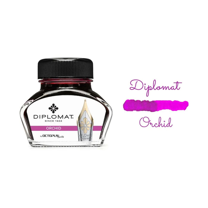 Diplomat is proud to accounce its collaboration with Octopus Fluids to launch a wide range of ink colours. Offered in an array of 15 different colors, these inks boast a smooth everyday writing experience. Perfect for use for both fountain pens using a piston or converter filling system as well as dip pens. Diplomat Octopus Ink Bottle Orchid is a shade of Pink packaged and sold in elegant 30ml glass bottle. The rich weight and soft curves make it a pleasure to hold in your hands. It‘s an ornament on every desk.