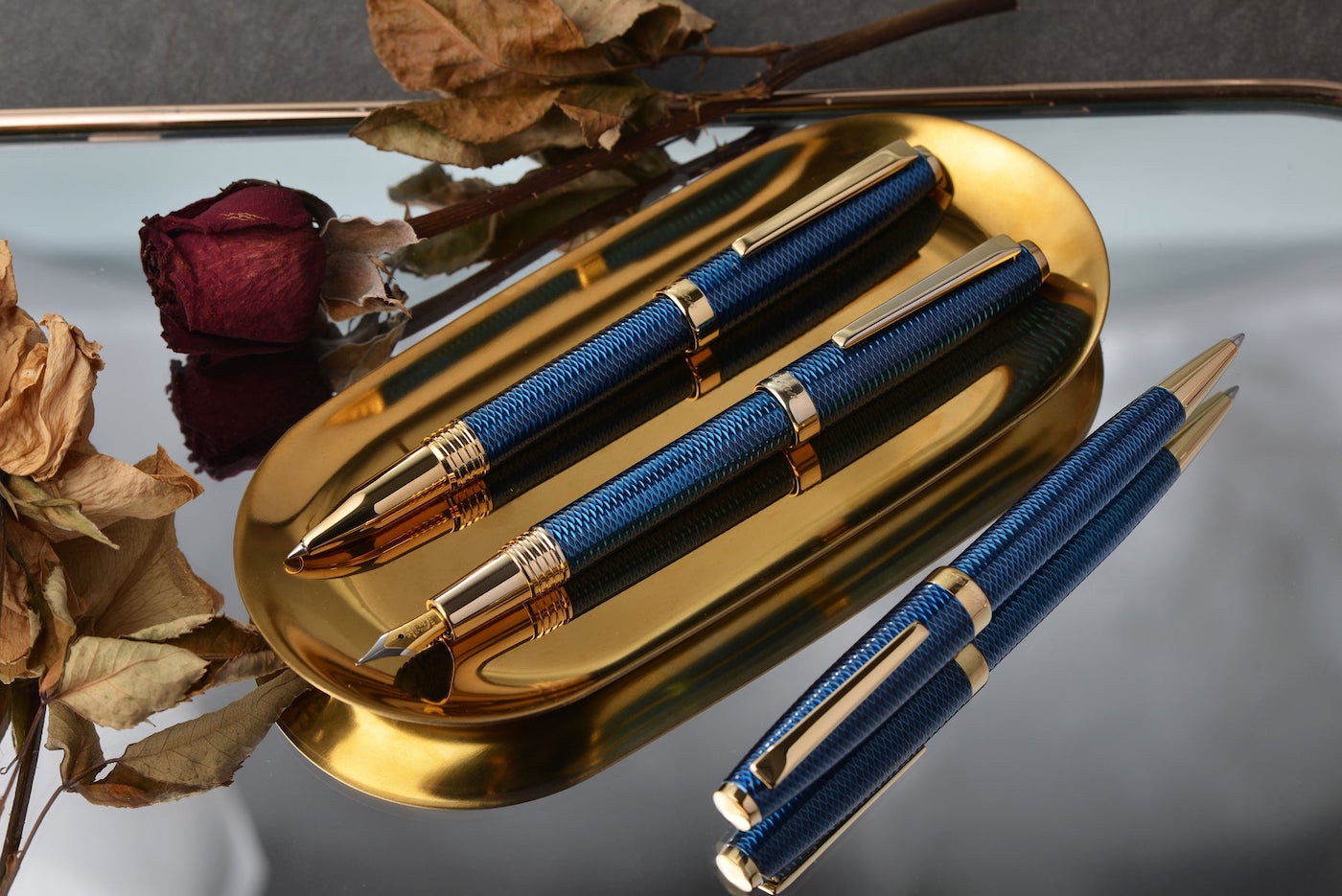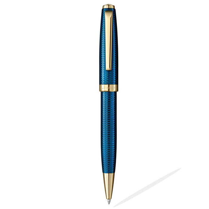 Gloria Sapphire Blue Ballpoint Pen is engraved with an endless diamond-shaped guilloche pattern with ruby red lacquer.
