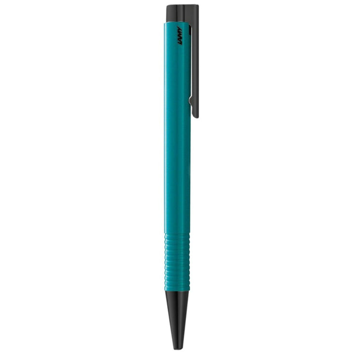 The Lamy Logo is ballpoint pen has a glossy Turquoise plastic barrel. Ridged finger grip; push-button retractor mechanism; properly-sprung metal pocket clip. Broad blue ballpoint refill.