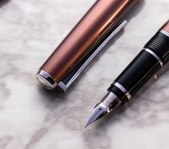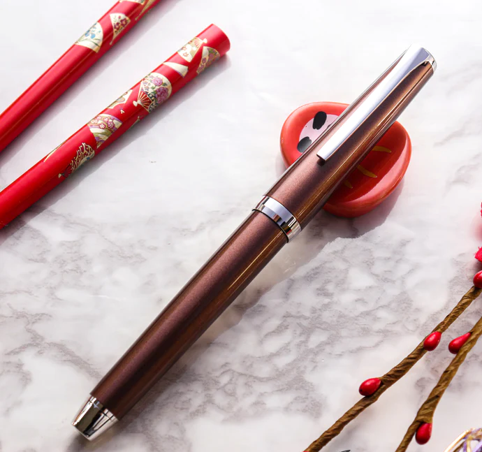 Pilot Falcon Metal Fountain Pen Brown comes with Chrome trim and has a Cartridge or Converter (Included) filing mechanism. It comes enhanced with a 14K Gold nib. The pen is packaged in a nice and elegant gift box.