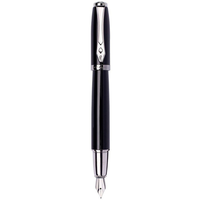 Perfect for everyday use, the Black Gun Metal version of the Time fountain pen features a shiny metal grip. The cap securely clicks on and off for closing the pen or posting the cap. The nib is stainless steel, and the body is crafted from brass. The glossy black body with silver accents embodies the precise military style that inspired it.