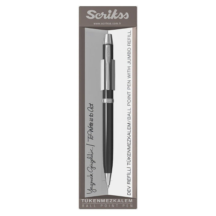 ABS (Acrylonitrile butadiene styrene) upper body plated with multiple layers of glossy black lacquer. Brass accessories plated with chromium. Stainless steel clip plated with chromium - arc type. Twist Mechanism. ABS (Acrylonitrile butadiene styrene) lower body plated with multiple layers of glossy black lacquer. Slim Scrikss refill - Cross type (see consumables).