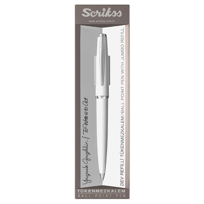 White acrylic carbon fiber upper body. Brass accessories plated with chromium. Stainless steel clip plated with chromium - arc type. Click Mechanism. White acrylic carbon fiber lower body. Scrikss Jumbo refill - Parker type (see consumables).