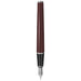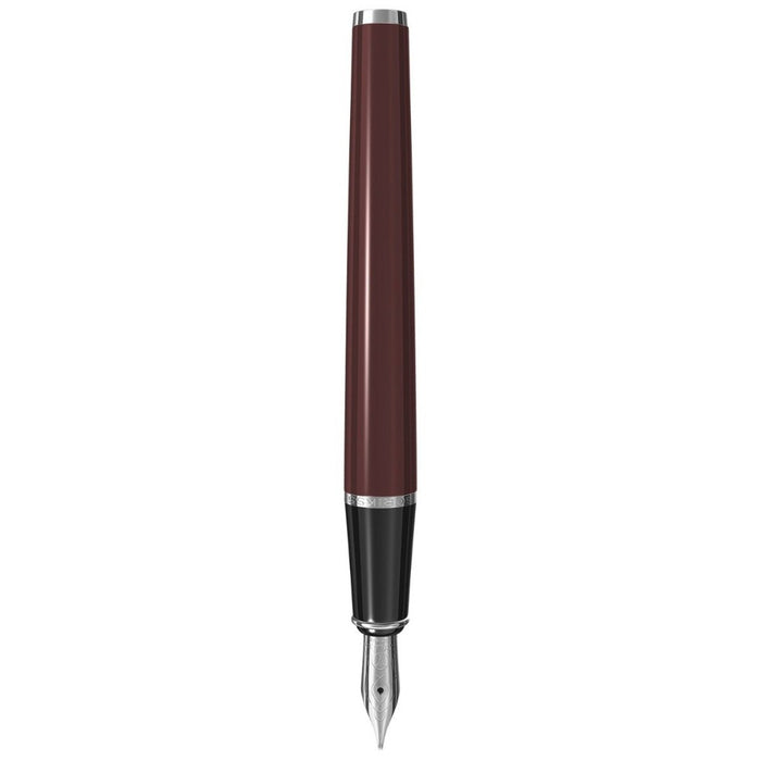 The chrome-plated clip, ring, and end. Stainless steel cover. Burgundy acrylic body. Chrome-plated iridium point steel insert, piston, and cartridge system.