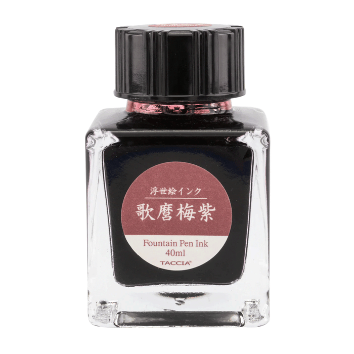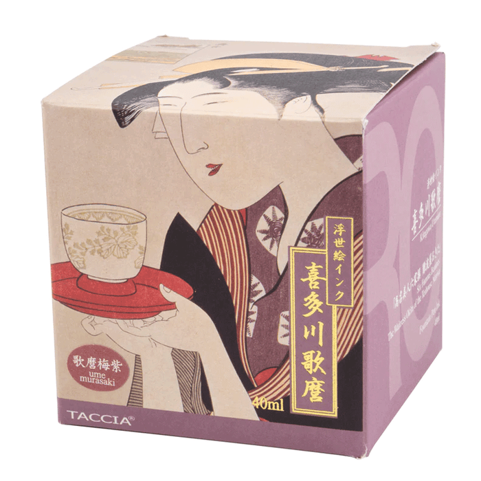Taccia's 2nd version has been released for another two great Ukiyo-e painters, Hiroshige and Utamaro. Hiroshige Utagawa has firstly drawn many arts in the motif of flower, bird, vegetation, insect etc. Utamaro Kitagawa has specialized in the art of "beautiful women". This time, we recreated the colors which they used to use for their arts and utilized their masterpiece works for the packages of our inks. Taccia Ukiyo-e Ink Ume Murasaki is a Crimson Cherry Blossom shade. It comes packed in a 40ML glass bottle.