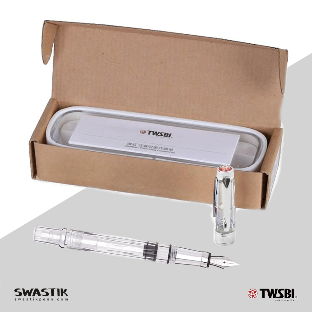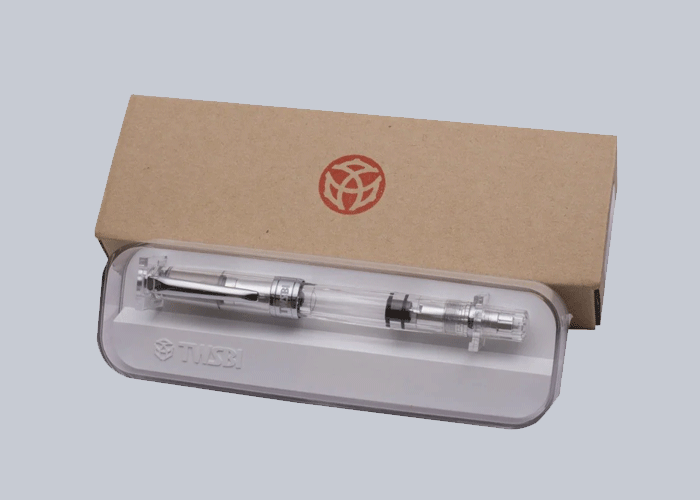 The pan arrived wrapped in a recycled paper cardboard box which contains crystal-clear plastic case with pen, short but well explained user manual, and two spare o-rings, TWSBI key and silicon grease hidden underneath the ‘pen stand’, which is a nice touch.