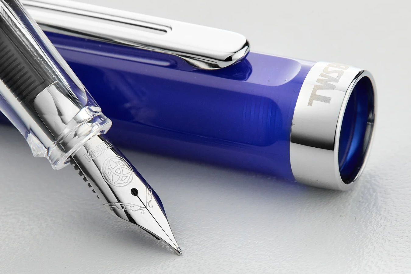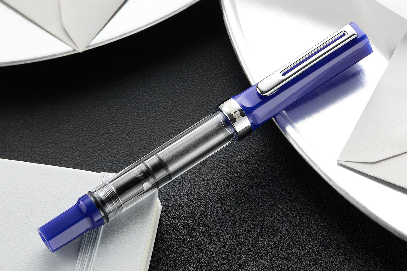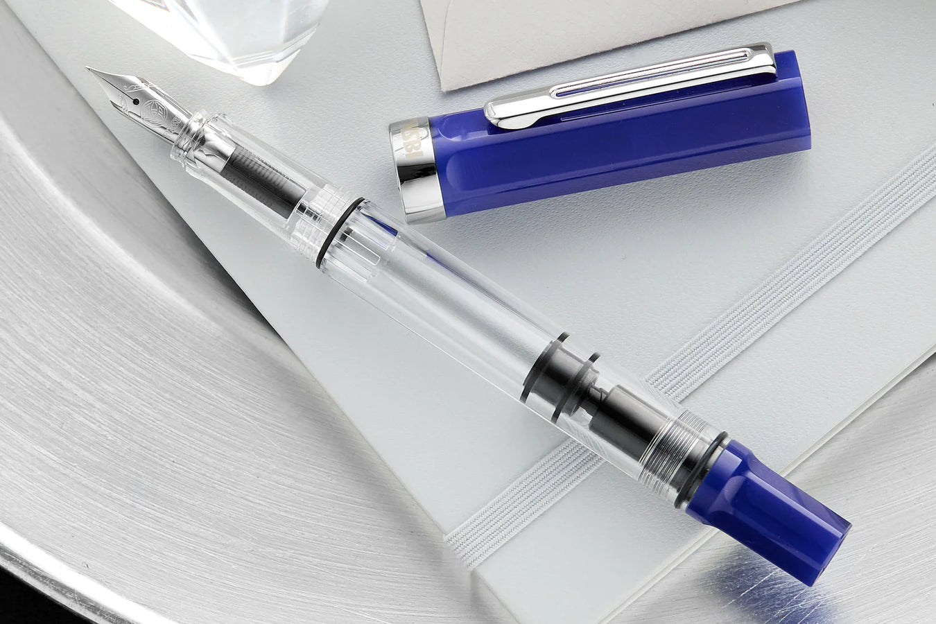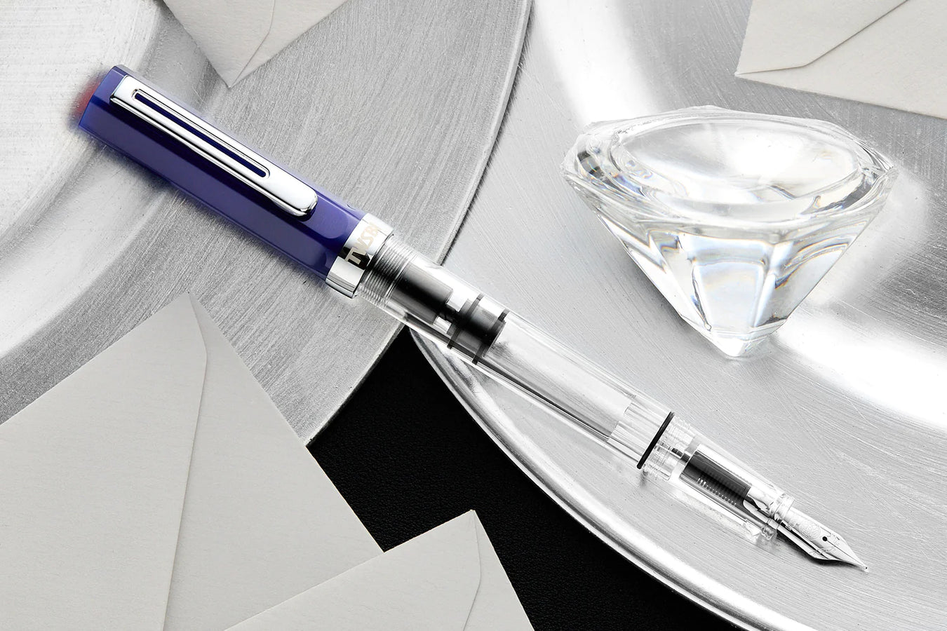 The TWSBI ECO fountain pen boasts an incredible value with its piston filling system and affordable price. Like many other TWSBI fountain pens, it features a crystal clear acrylic barrel so you can see your ink level, and a solid dark sapphire blue cap and piston knob. The pen cap has an inner cap to ensure a perfect seal when stored away. It is completed with silver trim and a silver stainless steel nib.