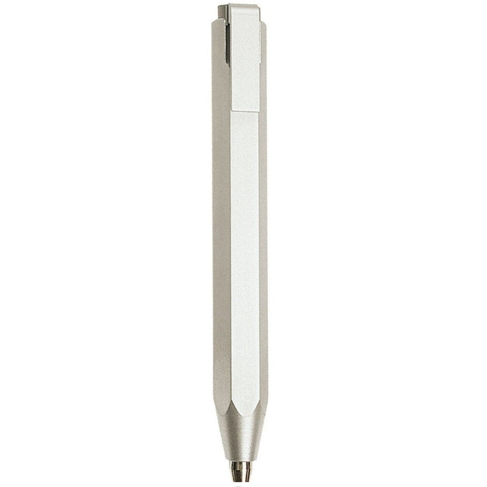 The body is made of natural finish anodized aluminum. Capped design with spring pocket clip. Pen uses standard ceramic rollerball pen refill. It has an elegant, practical, and ergonomic hexagonal design. It has a smooth finish aluminum grip area. Packaged in an elegant black presentation box with one preinstalled blue refill.